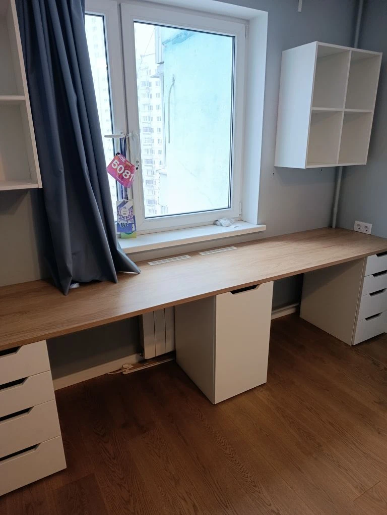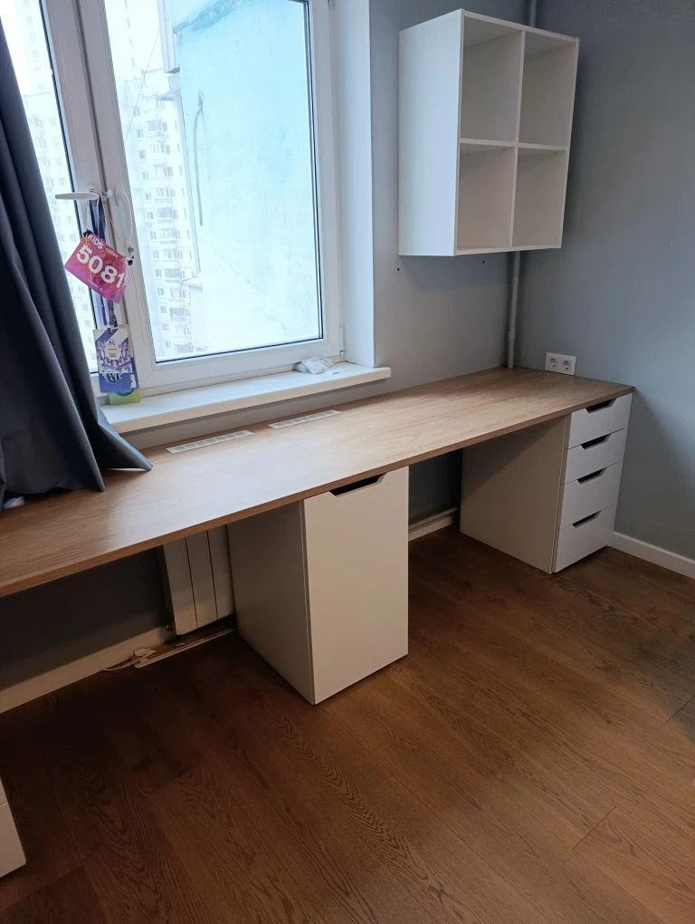 Рабочая зона в детскую комнату. Фасады выполнены из МДФ эмаль Бриз матовый RAL 9003. Корпус из ЛДСП Egger W1000 ST9 Белый премиум. Столешница из ЛДСП Egger H3730 ST10. Ящики с доводчиками DTC.