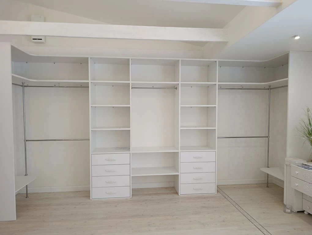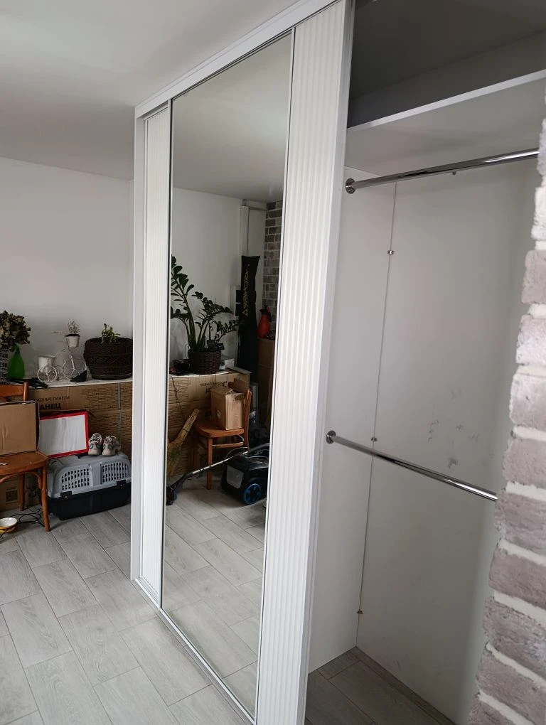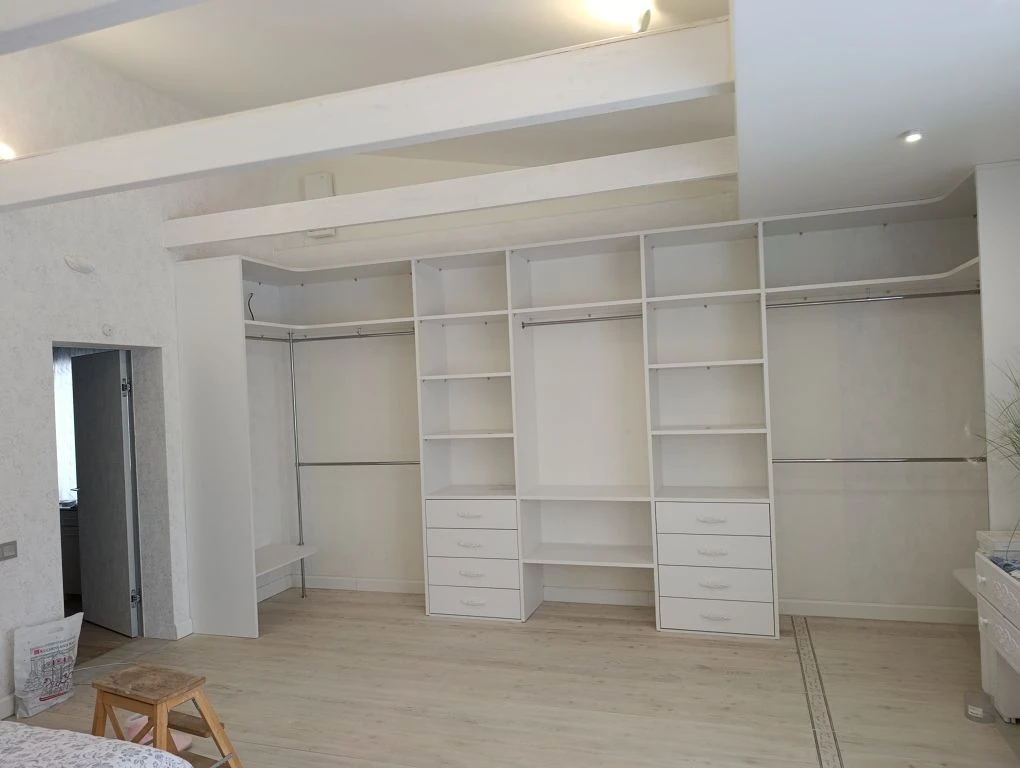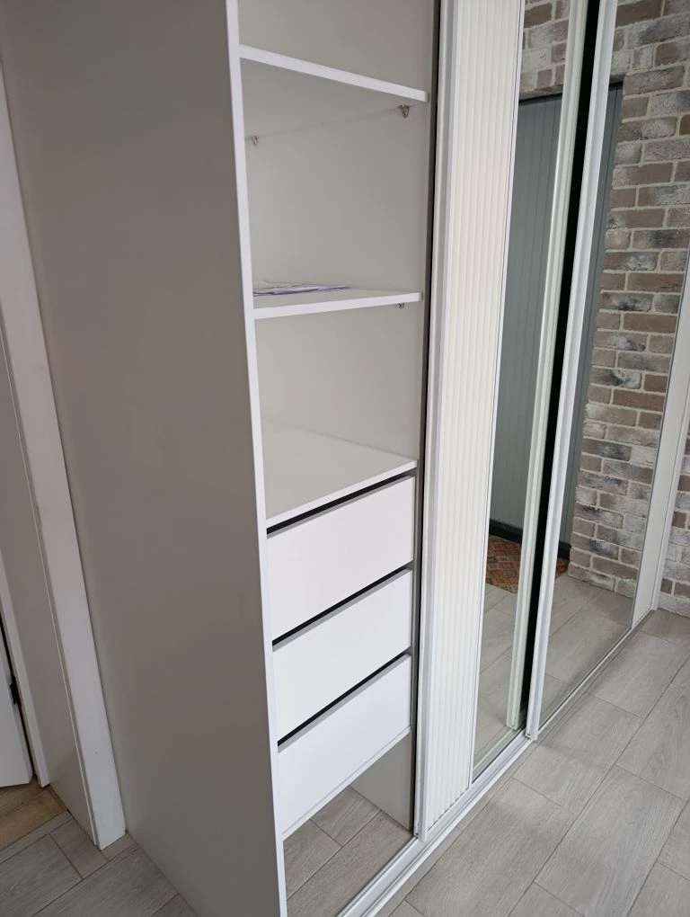 Гардеробная выполнена из ЛДСП Lamarti Белый Кристалл. Наполнение: штанги, ящики с доводчиками. Шкаф купе в прихожую. Двери выполнены в профиле Slim Белый матовый. Зеркало серебро, МДФ эмаль Бриз матовый. Корпус выполнен из ЛДСП Lamarti Белый Кристалл. Наполнение: штанги, ящики с доводчиками.