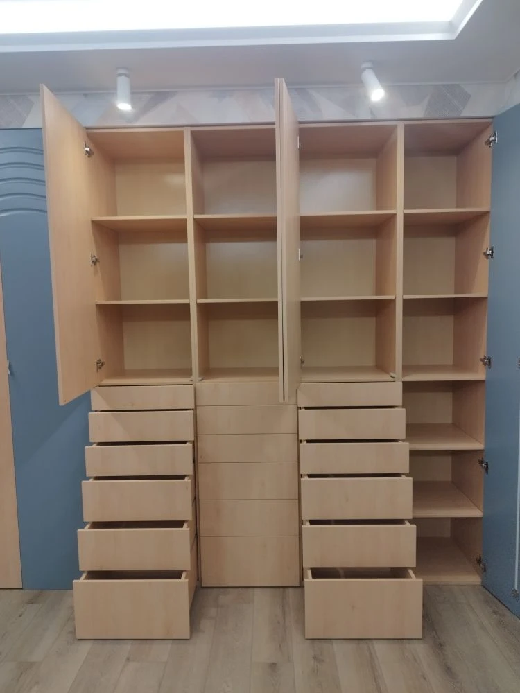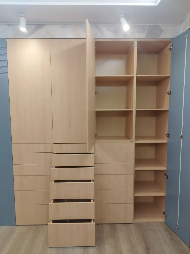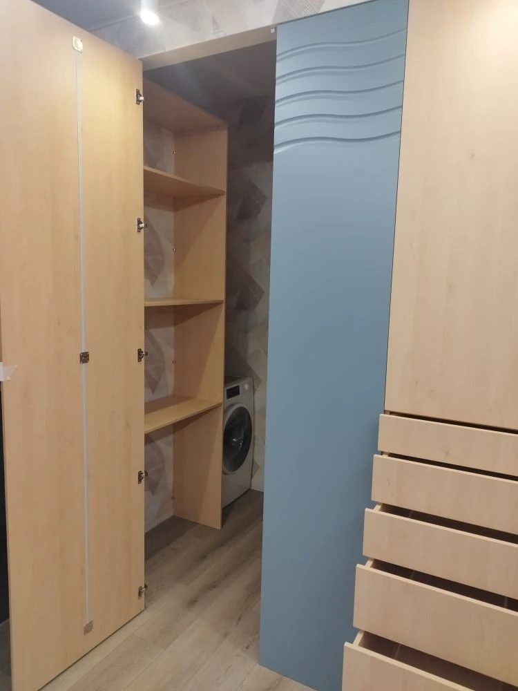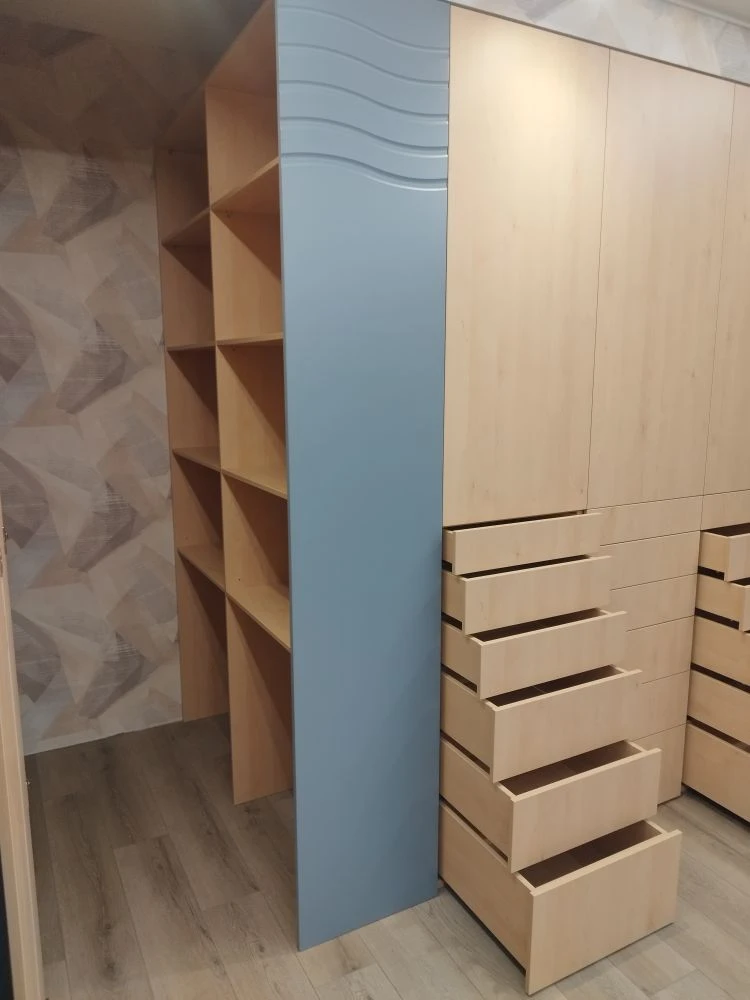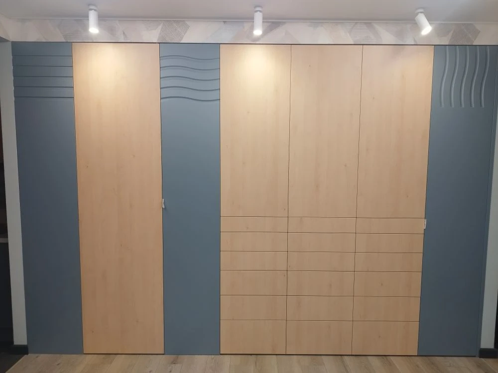 Сегодня мы хотим поделиться с вами по-настоящему смелым и интересным дизайн-проектом: представляем интегрированный шкаф, который плавно переходит в уютную гардеробную! Что делает его особенным? Конечно же, уникальная фрезеровка на эмалированных фасадах, созданная специально для этого интерьера. А для вашего комфорта – ящики с системой push-to-open, которые открываются легким нажатием. И обратите внимание, как стильно и лаконично смотрятся четкие линии на теплой древесной текстуре!