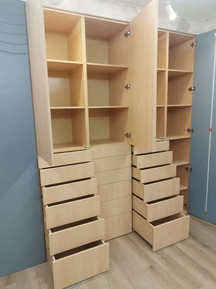 Фасады выполнены из ЛДСП Egger H4840 ST9 Клен Мандаль натуральный и МДФ эмаль с фрезеровкой Волна 25 мм. Корпус из ЛДСП Egger H4840 ST9 Клен Мандаль натуральный. Наполнение - полки, ящики с выталкивателем, петли без пружин, открывание фасадов с нажатием K-Push.