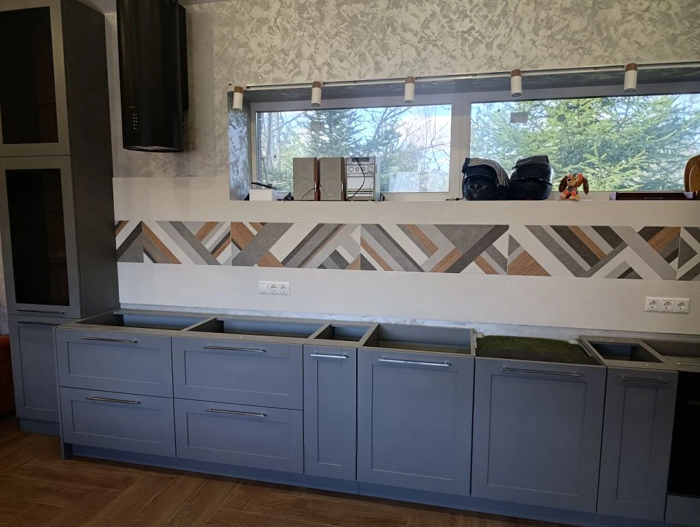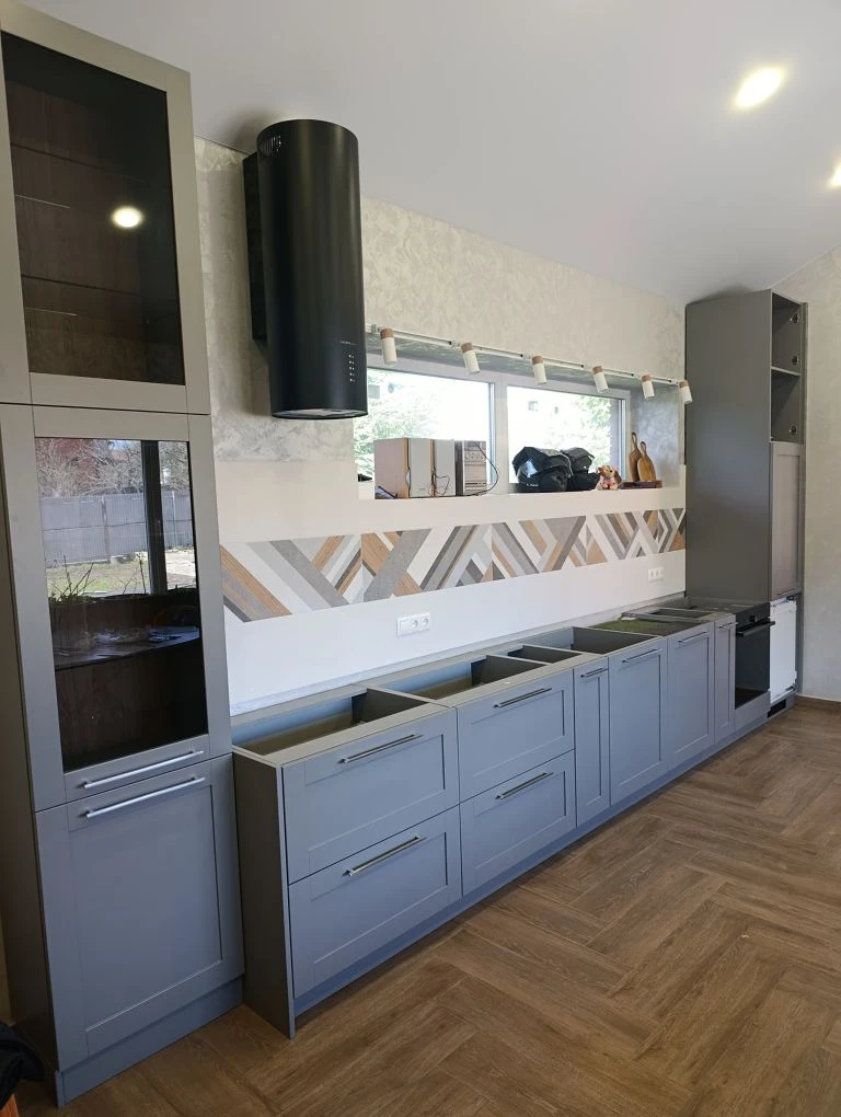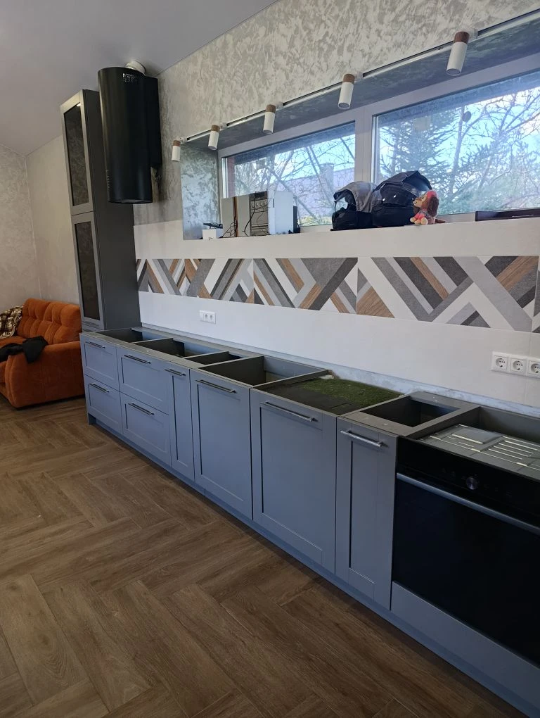 Кухня. Фасады распашные выполнены из МДФ эмаль Бриз матовый двухсторонний NCS S 5500-N. Рамочные фасады из МДФ эмаль Монако Бриз матовый двухсторонний, вставка стекло Планибель Серое. Корпус из ЛДСП Egger U732 ST9 Серый асфальт. Наполнение: полки, бутылочница, ящики Blum метабоксы, петли Blum, посудосушитель двухуровневый.