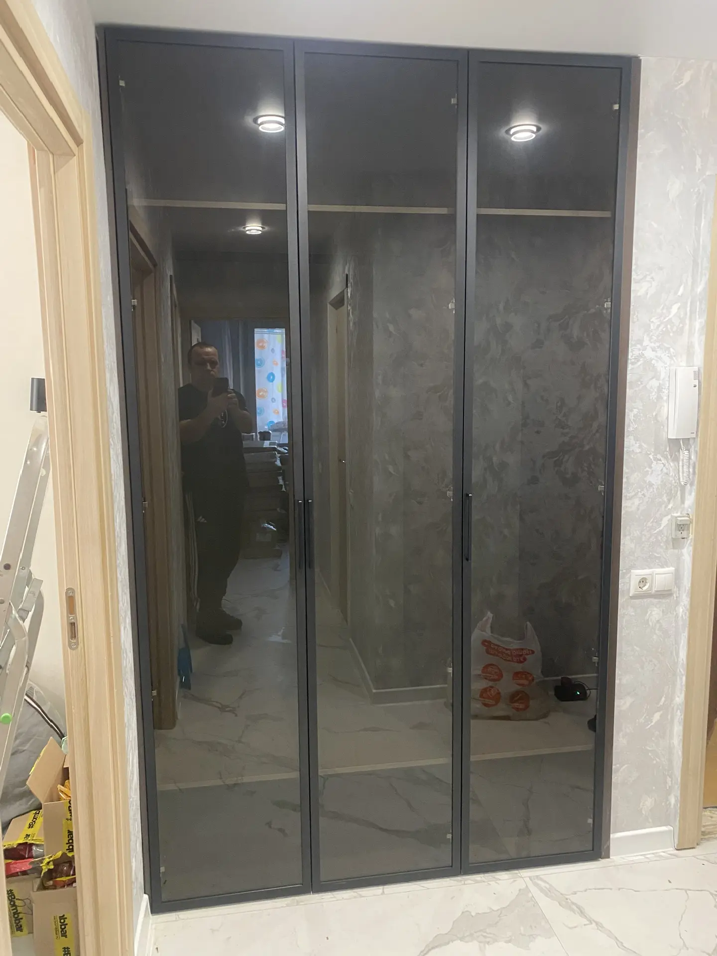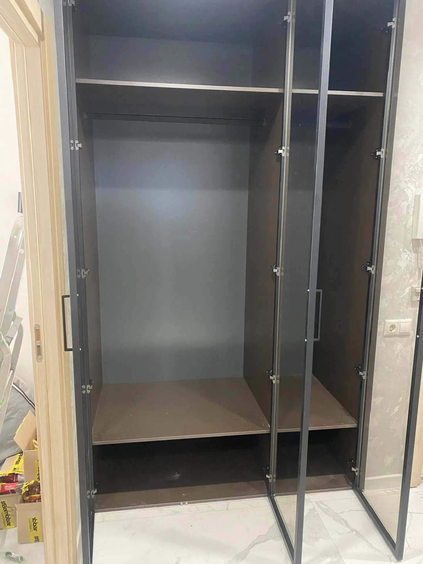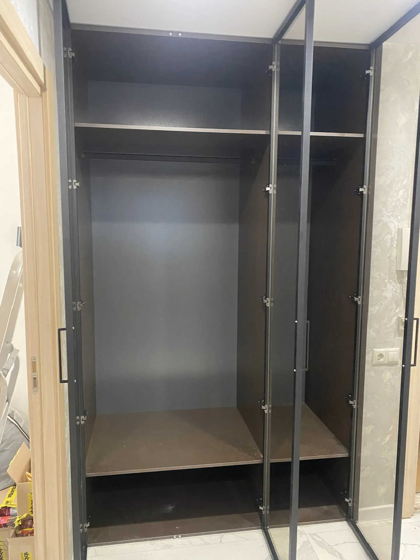 Распашной шкаф в прихожую. Двери выполнены в профиле Milan черный матовый, вставка стекло бронза. Корпус ЛДСП Lamarti Арабика. Петли накладные с доводчиком Китай. Наполнение^ полки, штанги. Ручки рейлинги.