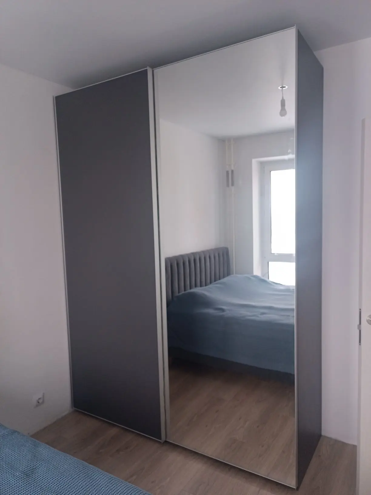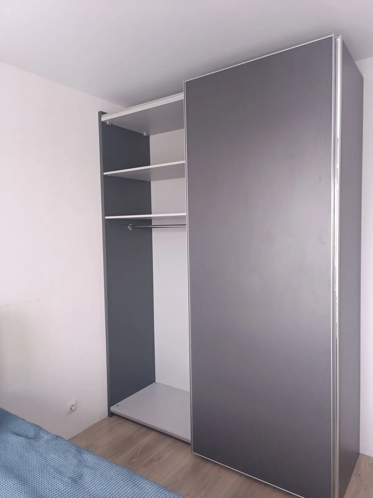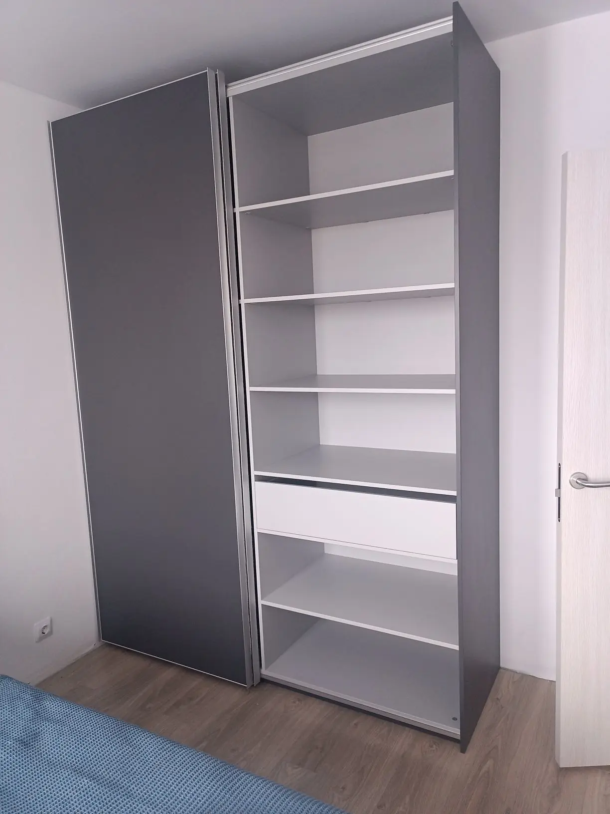 Шкаф купе с подвесной системой крепления дверей Космос в цвете серебро. Одна дверь выполнена из ЛДСП Эггер, Диамант серый U963 ST9. Вторая дверь зеркало серебро. Корпус ЛДСП Эггер, Серый перламутровый U763 ST9. Внутренний ящик с доводчиком.