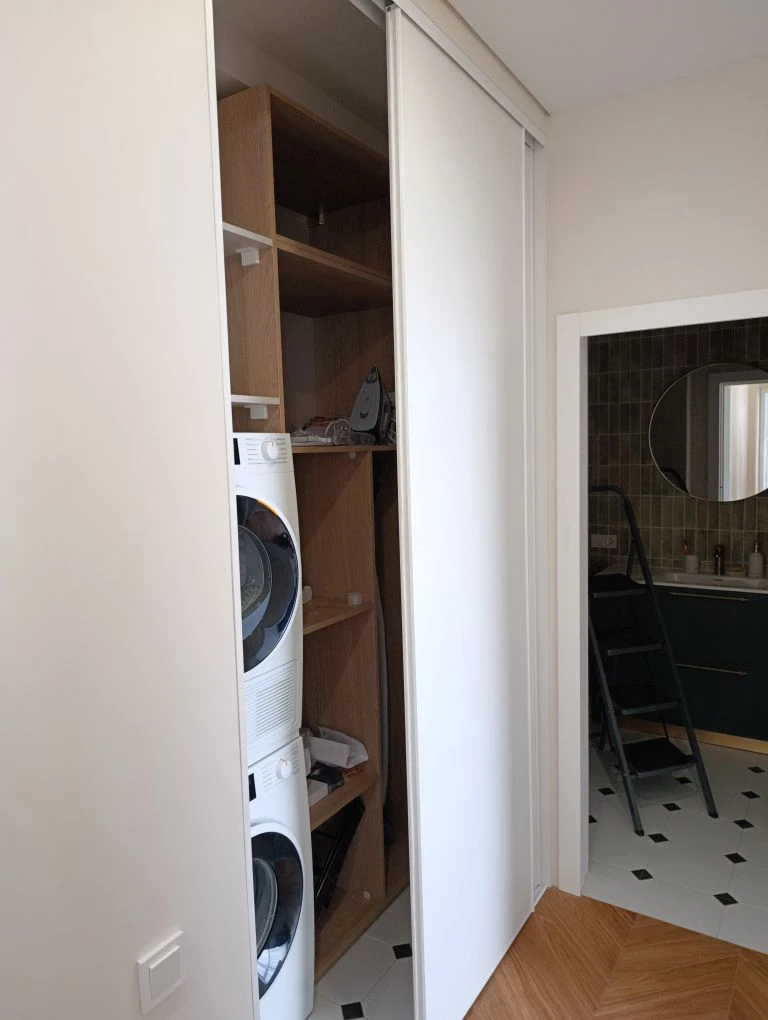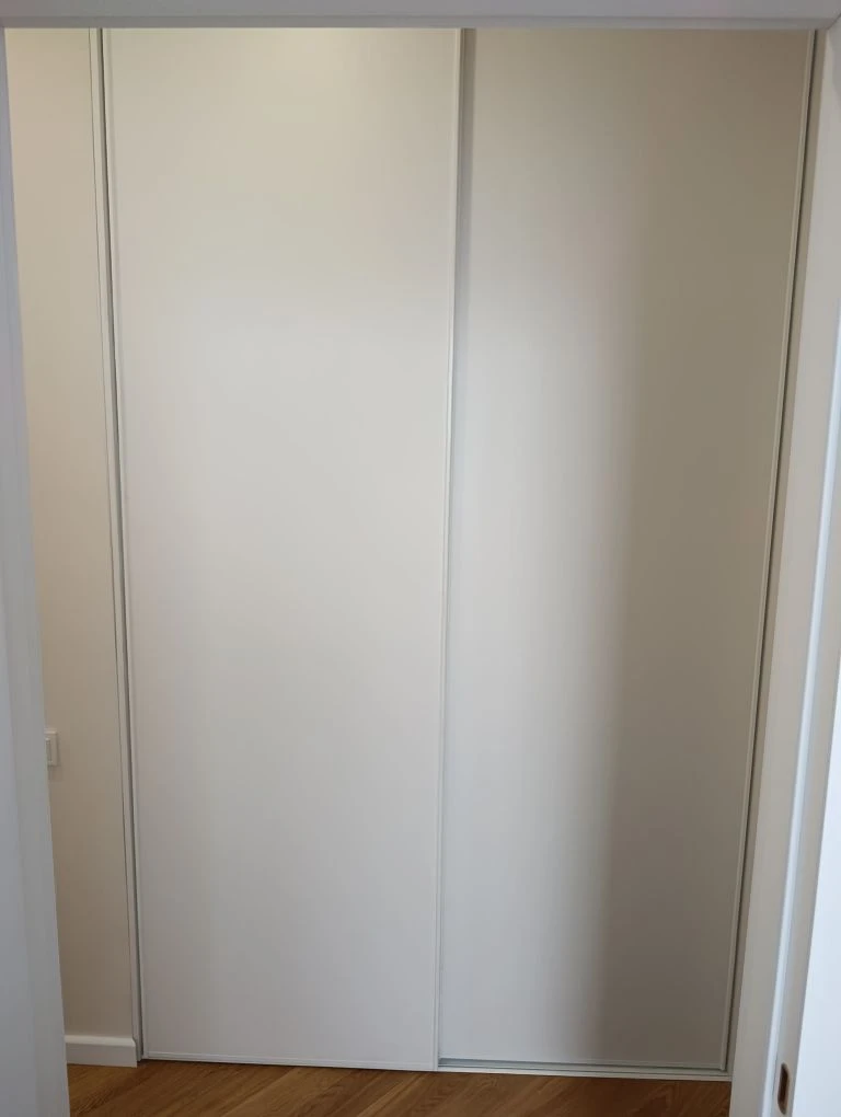 Двери купе для хозяйственного шкафа в выполнены в профиле Slim белый матовый со вставкой из ЛДСП Белый Кристалл.