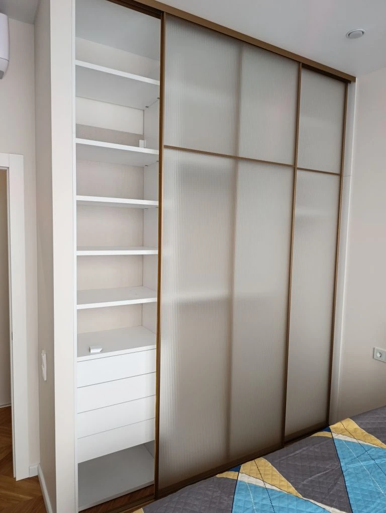 Шкаф купе в спальню. Двери выполнены в профиле Slim Латунь со вставкой стекло матовое Moru 4мм. Корпус из ЛДСП Lamarti Белый Кристалл. Наполнение: полки, ящики с доводчиком, штанга.