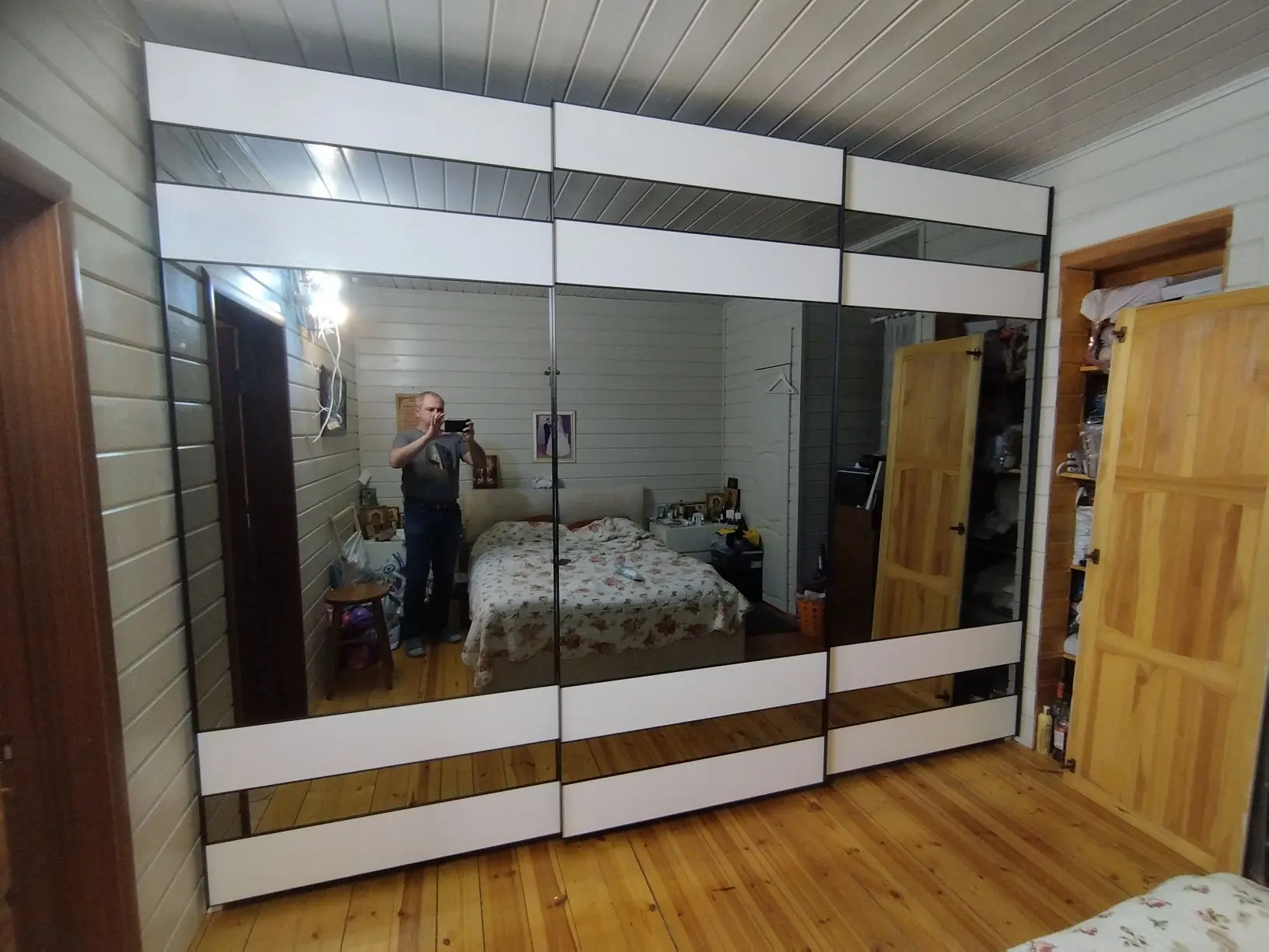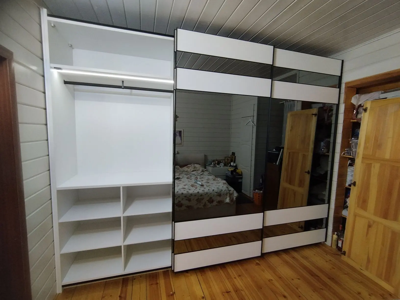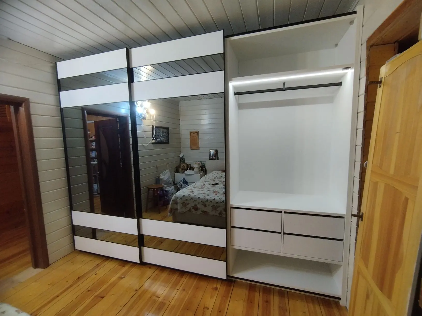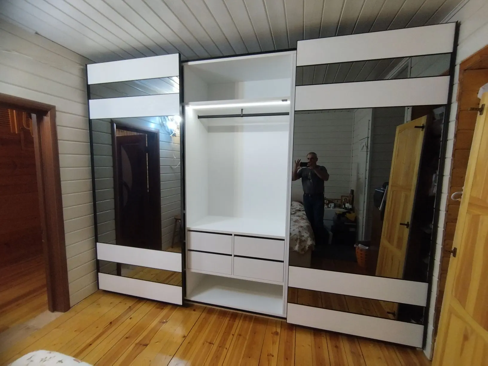 Шкаф купе в спальню. Выполнен с подвесной системой Космос в черном профиле. Наполнение дверей зеркало графит, ЛДСП Smart Club Bianko. Корпус выполнен из ЛДСП Egger W1000 ST38 Белый премиум. Наполнение: полки, штанги, ящики с доводчиками.