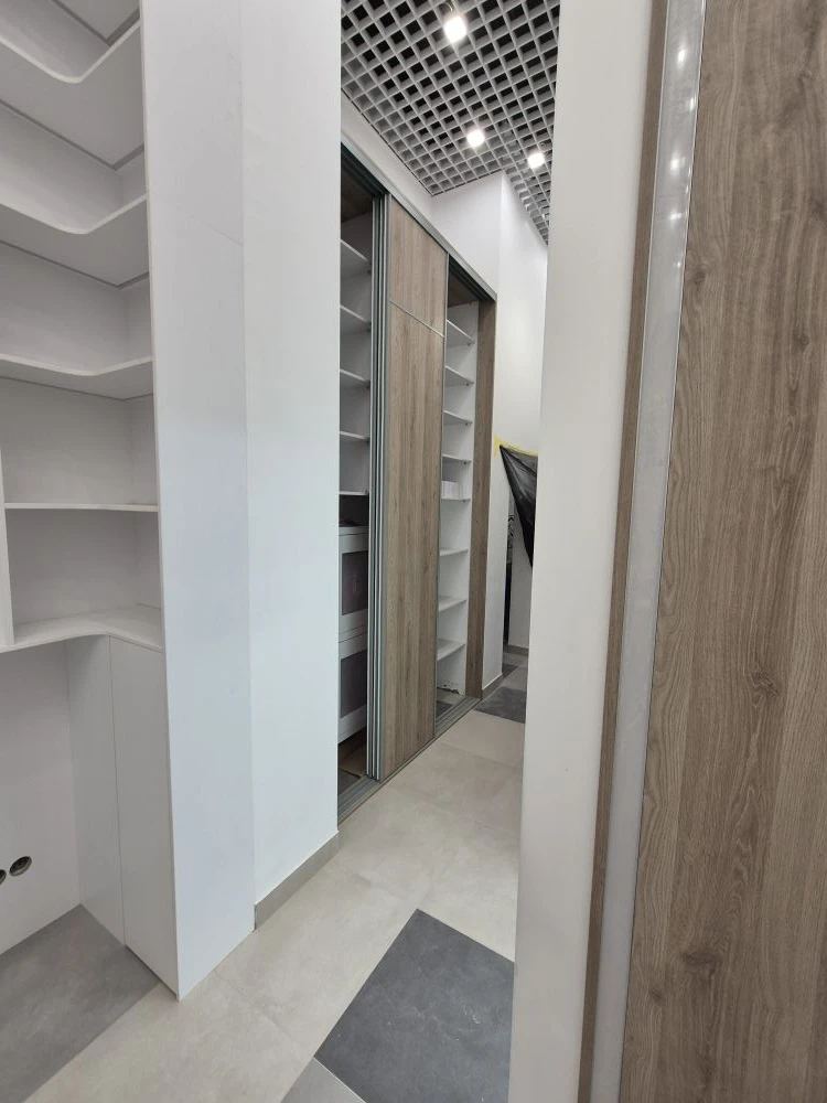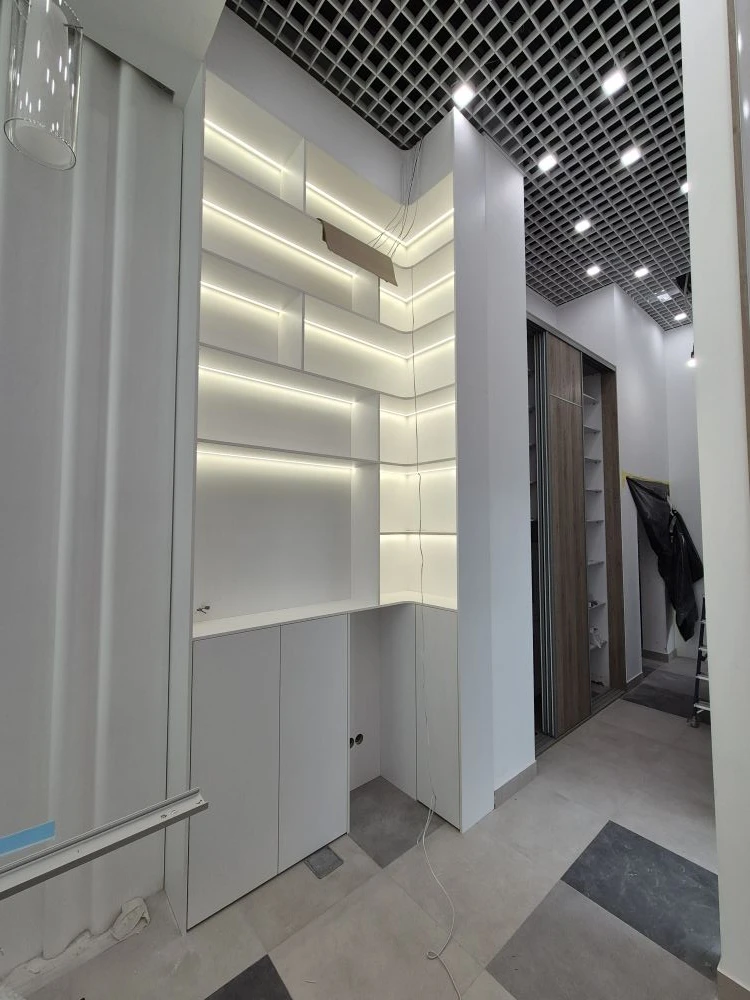 Мебель в стоматологическую клинику. Двери шкафа купе выполнены в профиле Slim, наполнение ЛДСП Smart C004 CLUB, зеркало серебро. Распашные двери из ЛДСП Egger W1100 ST9 Белый Альпийский. Корпус из ЛДСП Egger U707 ST9 Шелк серый, W1100 ST9 Белый Альпийский. Наполнение: полки, штанги, петли Blum, подсветка. Стеновые панели ЛДСП Smart C004 CLUB, подсветка.
