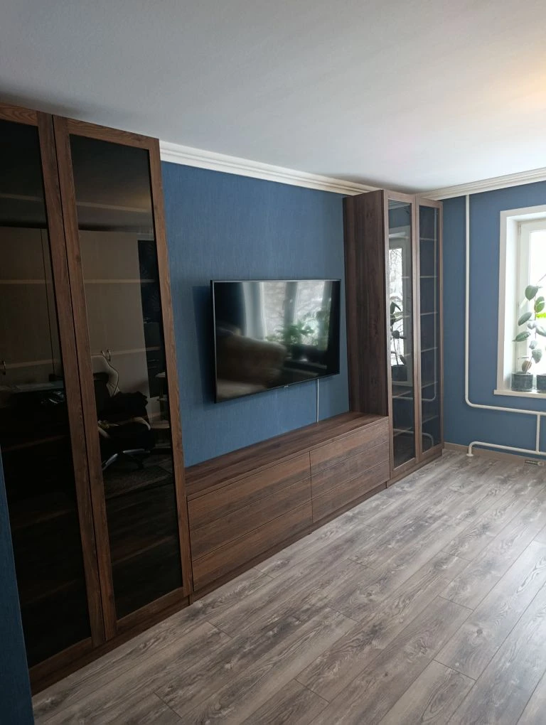Мебель в гостиную комнату. Два распашных библиотечных шкафа с рамочными фасадами ЛДСП Smart Glub C007, стекло бронза. Комод с фасадами из ЛДСП Smart Club C007. Корпуса выполнены из ЛДСП Egger H3702 ST10 Орех Пацифик табак. Петли без пружин, ящики с выталкивателями DTC.