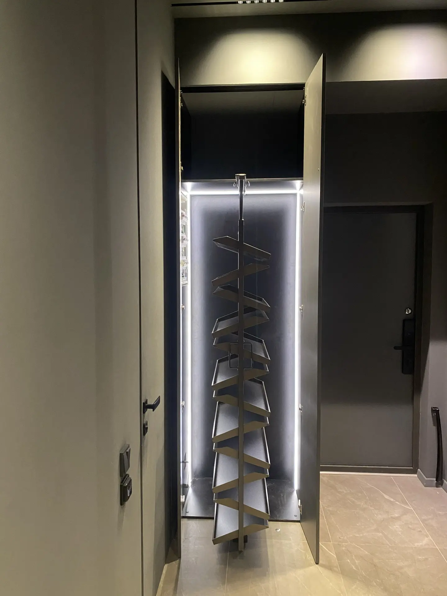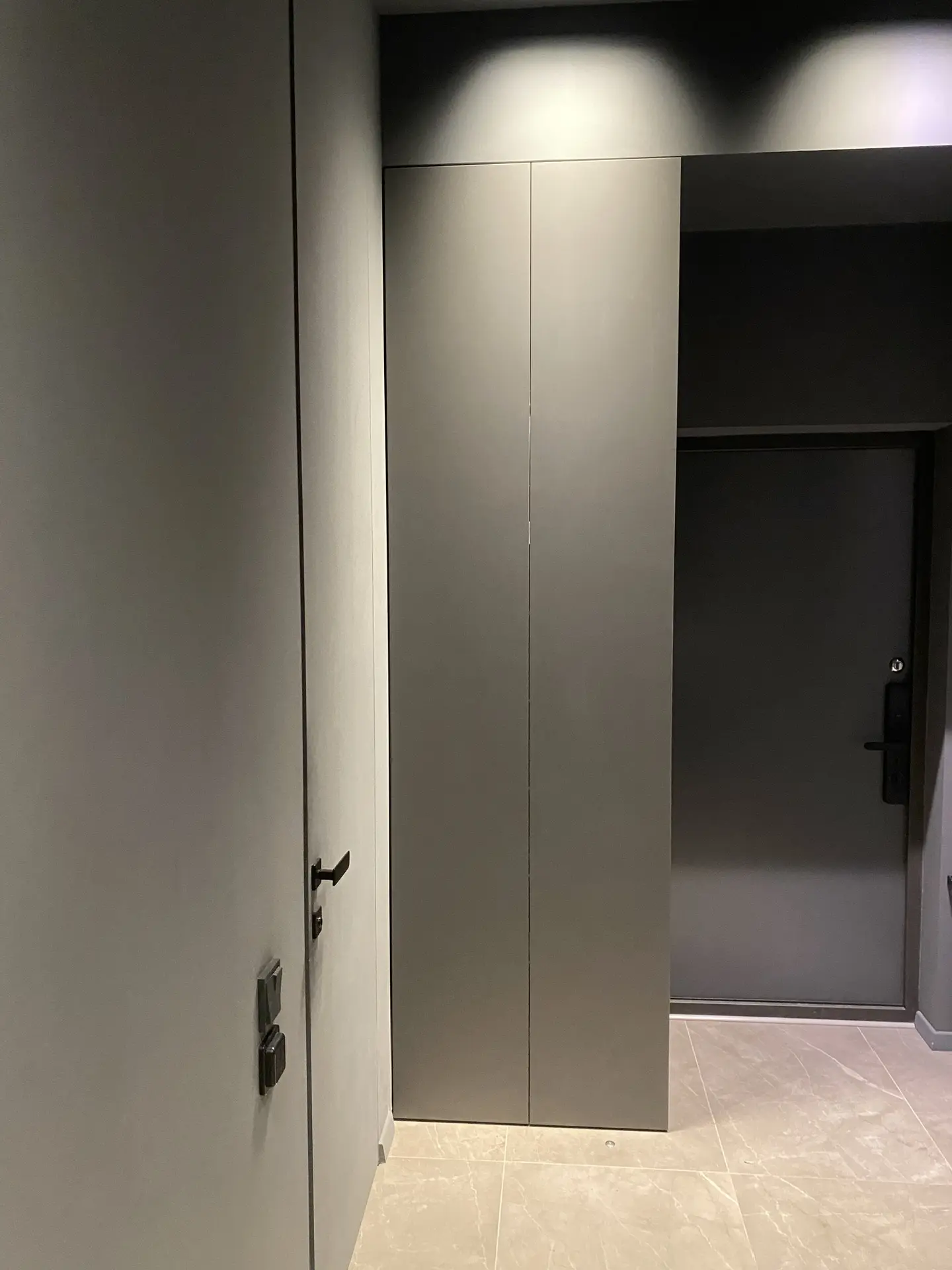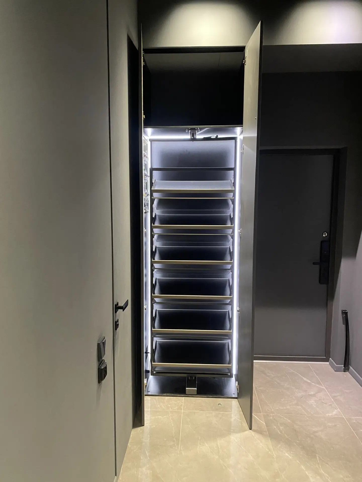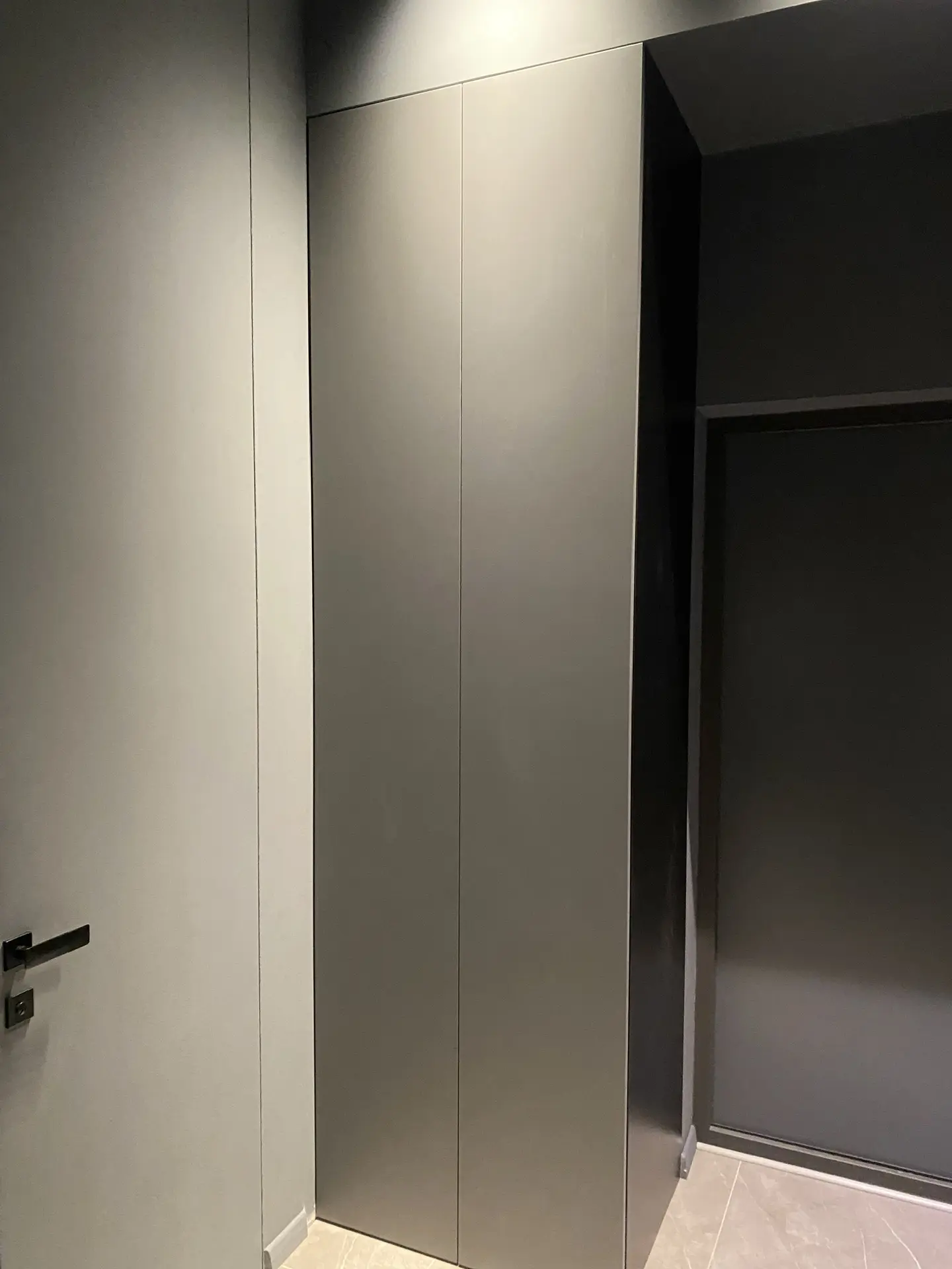 Распашной шкаф для обуви. Фасады выполнены из МДФ эмаль Бриз матовый. Корпус ЛДСП Lamarty Черный. Наполнение полка, петли BLUM с доводчиками, подсветка, обувница.